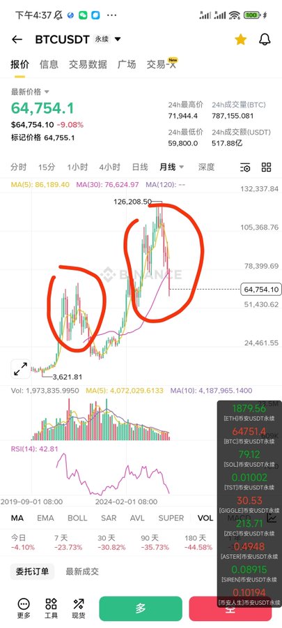 Looking at the monthly chart, the major players in BTC haven't changed at all, and this round of price movement is basically exactly the same as the previous peak.