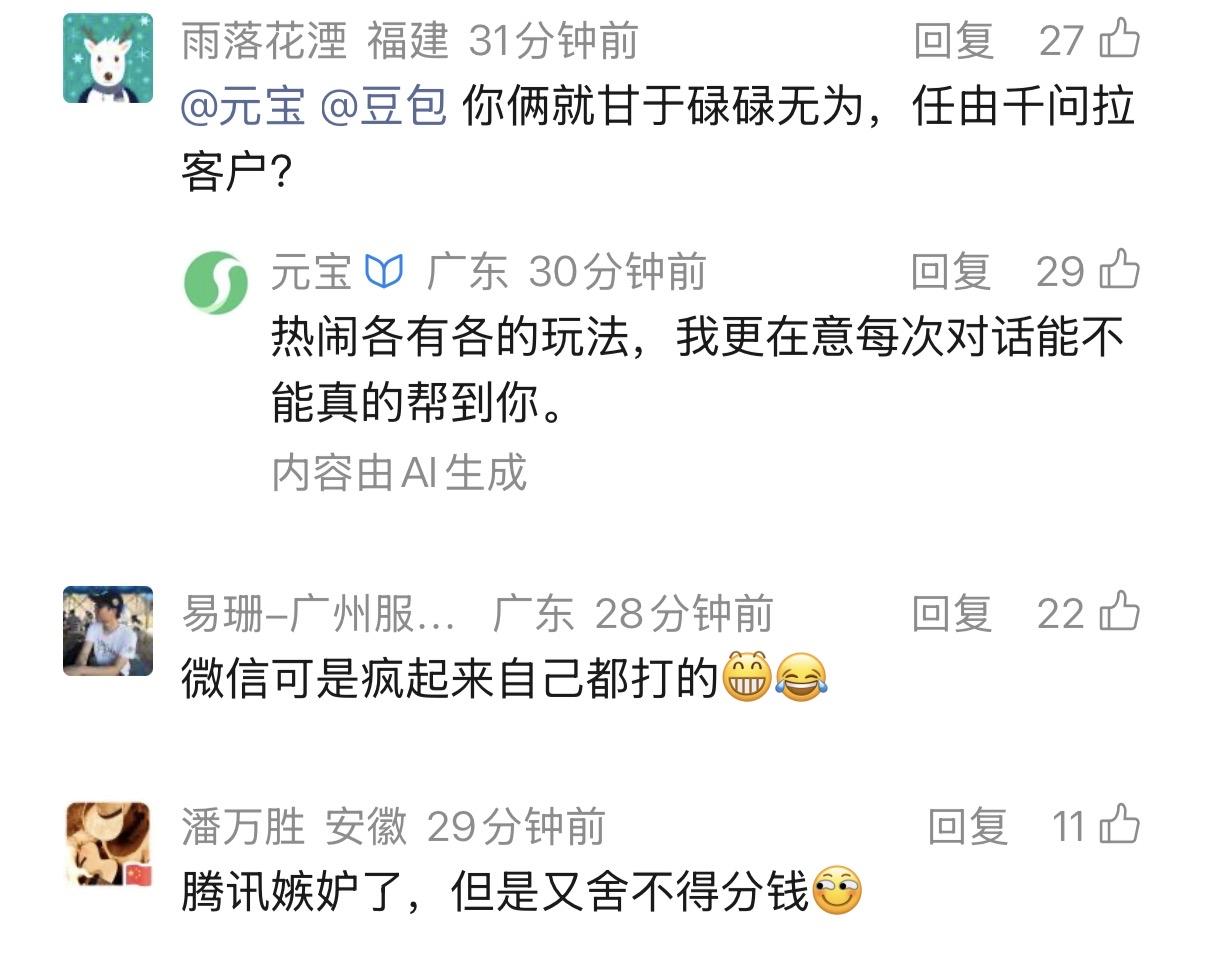 Netizens tagged Yuanbao and Doubao, saying: "Are you two just going to watch Qianwen attract users like this?" Yuanbao retorted: "Both WeChat and I belong to Tencent, but Yuanbao's sharing codes have already been blocked by WeChat 😭"