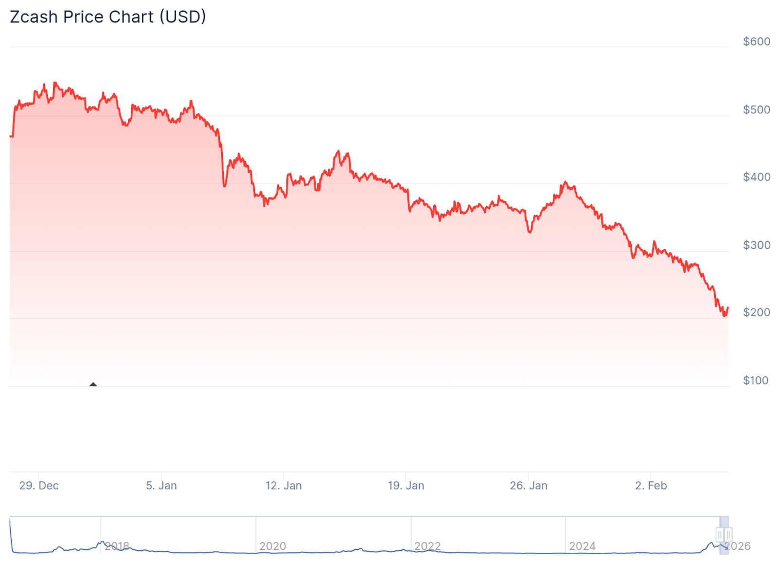 Zcash (ZEC) has fallen roughly 60% from its November 2025 high, extending a multi-month slide that has reversed much of the asset’s Q4 gains.