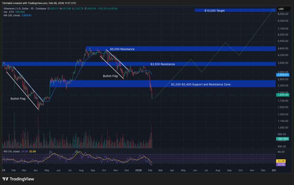 ETH is currently trading just below $2,000, with significant resistance expected near the $5,000 mark after peaking at an all-time high of $4,946.05 last August.
