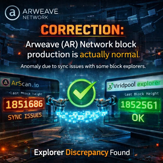 Although ArScan data indicated no new Arweave (AR) blocks for 24+ hours, the Viridpool explorer shows block height progressing to 1,852,561, suggesting normal on-chain activity. The discrepancy likely stems from explorer synchronization issues.