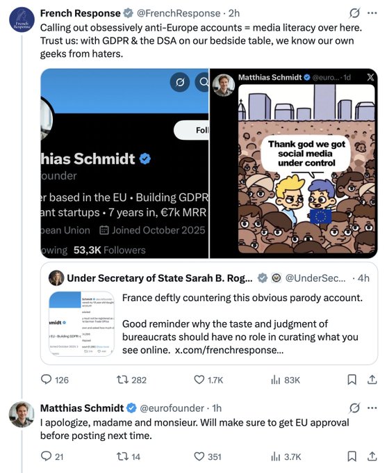 Why is the Official French Government crashing out about one of the funniest satire accounts on this website? His schtick is hilarious. Lean in and laugh.