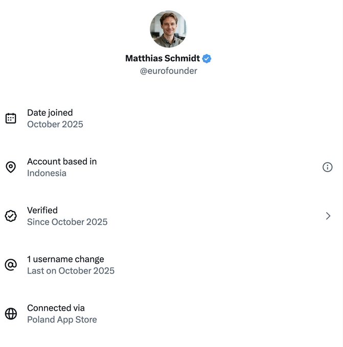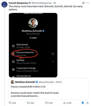 Also deceptively misleading. The French Government cut off the "connected via" portion of his bio. The account is connected via the "Poland App Store." Last time we checked, Poland was in the EU. The "based in" can be affected by VPN usage.
