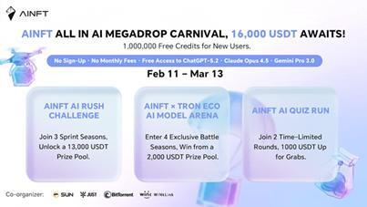To accelerate the adoption of large-scale AI models and enhance user experience, AINFT, in collaboration with core TRON ecosystem projects such as SUN.io, JUST, BitTorrent, and WINkLink, launched the " AINFT ALL IN AI MEGADROP CARNIVAL" series of events on February 11th. This event features a total prize pool of 16,000 USDT , offering diverse and engaging activities to reward global community users and helping more people experience the core functionalities of the AINFT AI large-scale model aggregation platform with zero barriers to entry, personally experiencing the technological charm of cutting-edge AI large-scale models.
