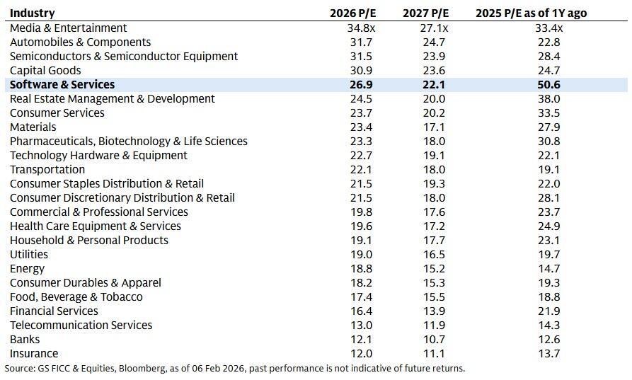 Valuations based on price-to-earnings ratios have fallen from 51 times a year ago to around 27 times currently, similar to the overall market level. However, Goldman Sachs analysts believe that the sector may still be expensive relative to earnings per share growth, and due to fears that artificial intelligence will disrupt existing industries, bargain hunters have not easily flocked to it. News such as Anthropic releasing new AI tools has further fueled these concerns.