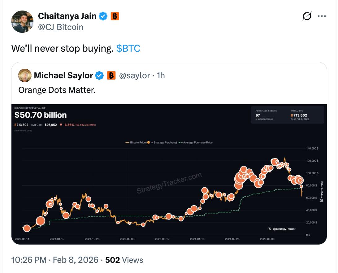 According to TechFlow TechFlow, on February 8th, Chaitanya Jain, Bitcoin strategy manager at Strategy, posted on social media, "We will never stop buying Bitcoin."