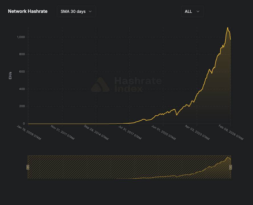 Bitcoin network hashrate statistics over time. Source: Hashrate Index (09/02/2026)