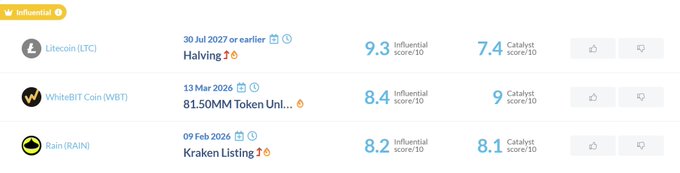 Most influential events in the last 24h 📈 🥇 9.3/10 influential, 7.4/10 catalyst scores $LTC (@ltcfoundation) 30 Jul 2027 or earlier Halving 👉 coinmarketcal.com/en/event/hal...… 🥈 8.4/10 influential, 9.0/10 catalyst scores $WBT (@whitebit) 13 Mar 2026 81.50MM Token Unlock 👉 coinmarketcal.com/en/event/81-...… 🥉 8.2/10 influential, 8.1/10 catalyst scores $RAIN (@rain__protocol) 09 Feb 2026 Kraken Listing 👉 coinmarketcal.com/en/event/kra...… More highlights 👉 coinmarketcal.com/en/highlight...