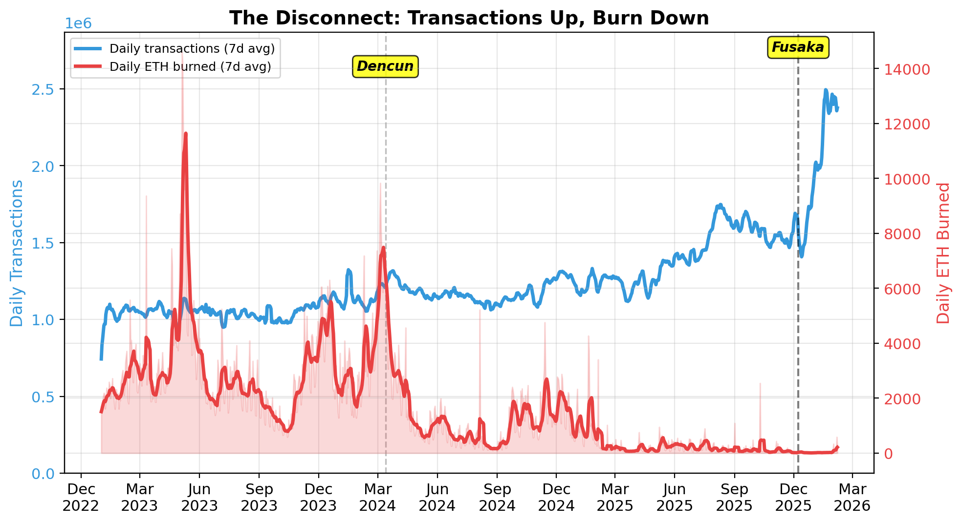 Fig 1: Daily transactions vs daily ETH burned, Jan 2023–Feb 2026. Each capacity upgrade (Dencun, Fusaka) accelerates the disconnect between activity and burn.