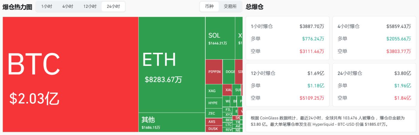 BTC liquidations totaled $203 million, and ETH liquidations totaled $82.8367 million. A total of 103,476 people were liquidated in the past 24 hours, with the largest single liquidation occurring on the Hyperliquid-BTC-USD trading pair, valued at $18.8507 million.