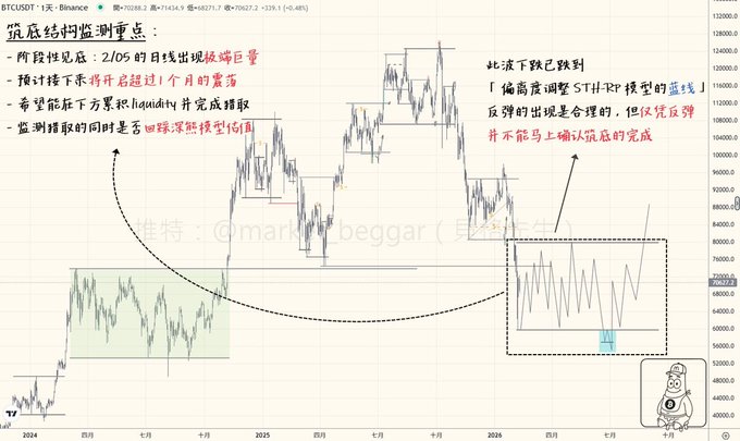 Extreme Volume Spike: The Start of a New Round of Volatility and Games⛳️ Picking up from the last thread—this near cliff-drop dump almost triggered those deep bear valuation models with a 100% historical win rate, including the PSIP bottom signal I shared yesterday. Unfortunately, “almost” doesn’t cut it—we’re still missing that “final shakeout” before a true bottom, but last week’s insane volume is a clear sign: a new round of choppy volatility is about to kick off 👇 Check the chart below—I’ve sketched out what I think is the “ideal BTC bottom formation.” Here are some key signals from last week’s crash you can’t ignore 🚨: 🔺 On 2/05, we saw extreme volume—the biggest since August 2024. 🔺 Fear & Greed Index hit 5, the lowest since 2019. 🔺 Price dumped right onto the deviation-adjusted STH-RP model blue line🔵. 🔺 Price instantly fell into the “super consolidation zone” from Mar-Oct 2024. 🔺 Just one step away from triggering all major deep bear valuation signals. 📖 “The Power of the Blue Line”: Deep Dive on BTC’s Strong Support & Historical Backtests x.com/market_beggar/status/201...… All these signs basically confirm one thing: “As long as there’s no black swan, wide-range chop is almost inevitable‼️” Remember just a short while ago: After the local bottom in the Nov 21, 2025 dump, BTC churned sideways for almost two months. Volatility compressed hard toward the end, then the market picked a direction—breaking down into a trending dump. My thoughts on that range and volatility are in this thread: 📖 Downside Risk Rises & Calm Before the Storm x.com/market_beggar/status/201...… “Chop ➡️ Volatility Compression ➡️ Trend ➡️ Massive Volume ➡️ Chop …” That’s been BTC’s cycle since day one—rinse and repeat, nothing new. Given the current signals, I’m betting there’s a high probability BTC is about to enter another period of wide, whipsawing volatility. But here’s the difference from last November’s dump: ➡️ Back then, price was at the highs. Now, we’re almost in the deep bear valuation zone. ➡️ This is the first time this cycle BTC’s dropped back to the model’s blue line. TL;DR: Odds are high this dump will carve out the final bottom✅ Same playbook as last November’s crash + massive volume: Since wide-range chop is almost a lock, here’s what I’ll be watching: ➡️ Does clear liquidity get left above or below during the chop? ➡️ If we see liquidity left below, it needs to be swept first before a real move higher. ➡️ So, don’t ape long until those lower liquidity pools are cleared. ➡️ Since we’re near deep bear bottom zones, also watch for: “If a downside stop hunt nukes the lows, does it tag the model’s value zone? That’s the confluence you want.” One last hot topic: “Could a US stock crash drag BTC lower❓” Easy answer: Flashback to August 2024—carry trade unwind, Sam rules, all that jazz—market nuked, US stocks pulled back, BTC flash crashed to 49K. People panicked, some even called the bull market dead. But zoom out: S&P 500 only corrected less than 10% since mid-July 2024. BTC dumped harder, but I didn’t see real capitulation. Instead, BTC printed a textbook bullish stop hunt🔥 I’ve done a post-mortem on that move—check it here: x.com/market_beggar/status/187...… So, looking back, that US stock “crash” was just a normal correction in an uptrend. If we get a similar correction again, sure—BTC might get dragged down short-term, but that’s not necessarily bearish. In fact, if BTC is already in a wide choppy range when stocks correct, that could be the catalyst for one last stop hunt sweep into the deep bear bottom zone—a true “final flush”—setting up the perfect bottom and giving us all the conviction to ape in🔋 Of course, this is just scenario analysis, not a prediction. I don’t have a crystal ball—I can’t say if US stocks will correct. But if it happens, maybe we run the August 2024 script back one more time… 👀 That’s all for today—hope this helps🫡 // 📚 Further Reading: Latest Deep Bear Valuation Data: Cheap BTC Incoming x.com/market_beggar/status/201...… TA Thread: Ideal Bottom Structure from a Liquidity Perspective x.com/market_beggar/status/201...… “Gap Fill in Progress”: 74K Target Hit, Where’s the End of the Dump? x.com/market_beggar/status/201...…