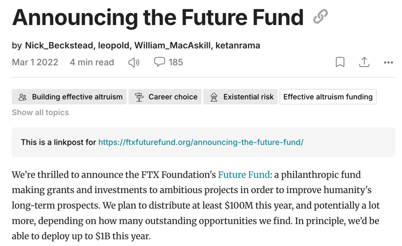 This "genius," whose credentials are a mix of genuine and fabricated, managed to secure investments in Anthropic and Anysphere within a month—a feat not merely a matter of luck. On February 28, 2022, SBF publicly launched the Future Fund at the Effective Altruism Forum (https://forum.effectivealtruism.org/posts/2mx6xrDrwiEKzfgks/announcing-the-future-fund-1). As part of FTX, this fund is managed by several FTX executives and focuses on areas that "improve the long-term prospects of humanity," such as AI safety, long-termism, and biological risks.