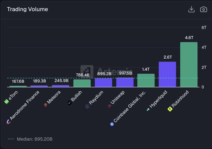 On-chain exchanges are crushing Coinbase. According to Artemis data, Hyperliquid's nominal trading volume has reached $2.6 trillion, while Coinbase's is only $1.4 trillion—HL's trading volume is nearly twice that of Coinbase. The harsh reality is: year-to-date, its price has risen by +31.7%, but its share price has fallen by -27%. In terms of trading volume rankings, Hyperliquid has surpassed established DEXs like Uniswap and Raydium, second only to Robinhood.