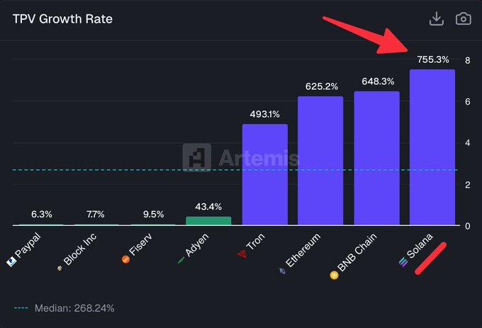 🔥 NOW: Solana tops all payment platforms with 755.3% TPV growth rate, per Artemis data.