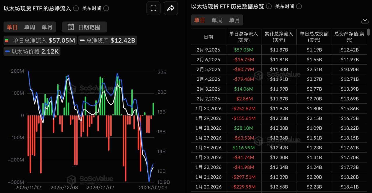 According to ME News, on February 10 (UTC+8), based on SoSoValue data, the Ethereum spot ETF saw a total net inflow of $57.0481 million yesterday (February 9, Eastern Time).