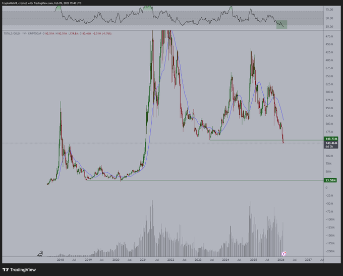 The current valuation of #Altcoins against Gold is the lowest it has ever been. The RSI has turned to 25 on the weekly timeframe. This has never happened. The chart itself also provided the lowest valuation since 2021 and it swept the low. The only occurrence that we've seen this happening before is when we saw the COVID crash (a Black Swan). The recent crash has been a Black Swan.