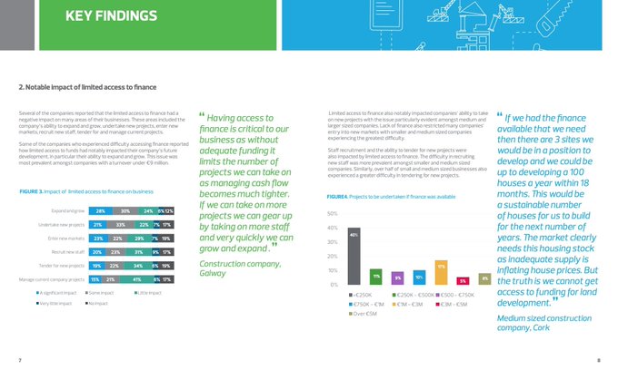 "This report should sound alarm bells for those concerned with regional development, spatial strategy and in resolving the housing crisis. It shows that construction companies are experiencing difficulty in securing finance. This is especially acute in the regions and amongst SMEs. This report confirms that lending outside the urban centres is particularly challenged...traditional sources are unwilling to lend. This is not a call for a return to the speculative lending of the past. This report highlights many cases where companies are unable to secure finance to develop viable and essential residential projects particularly outside the greater Dublin area. It also highlights the paucity of funding available for construction companies to invest in plant, staff, technology, innovation and other core functions. At a macro-level, this threatens to undermine productivity in the industry and limit its growth over the coming decade."