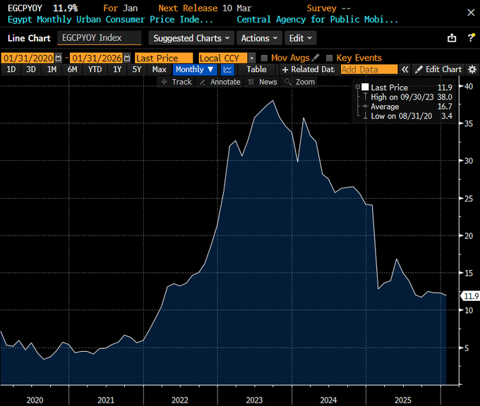 Egypt is on a positive autopilot: • Inflation fell from 38% in late 2023 to 11.9% in January • The pound is strengthening • Reserves are rising What's helping? • A recent exit from crisis • International support • Falling global interest rates bloomberg.com/news/articles/20...