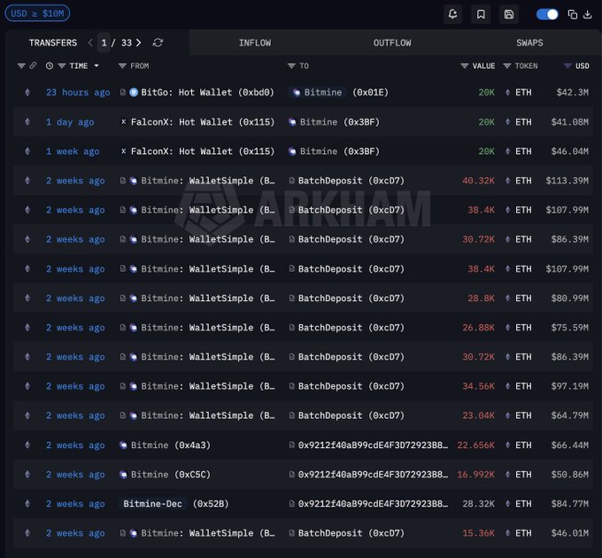 Tom Lee’s Bitmine bought another 40,000 ETH in the last 24 hours, worth $88M at time of purchase.