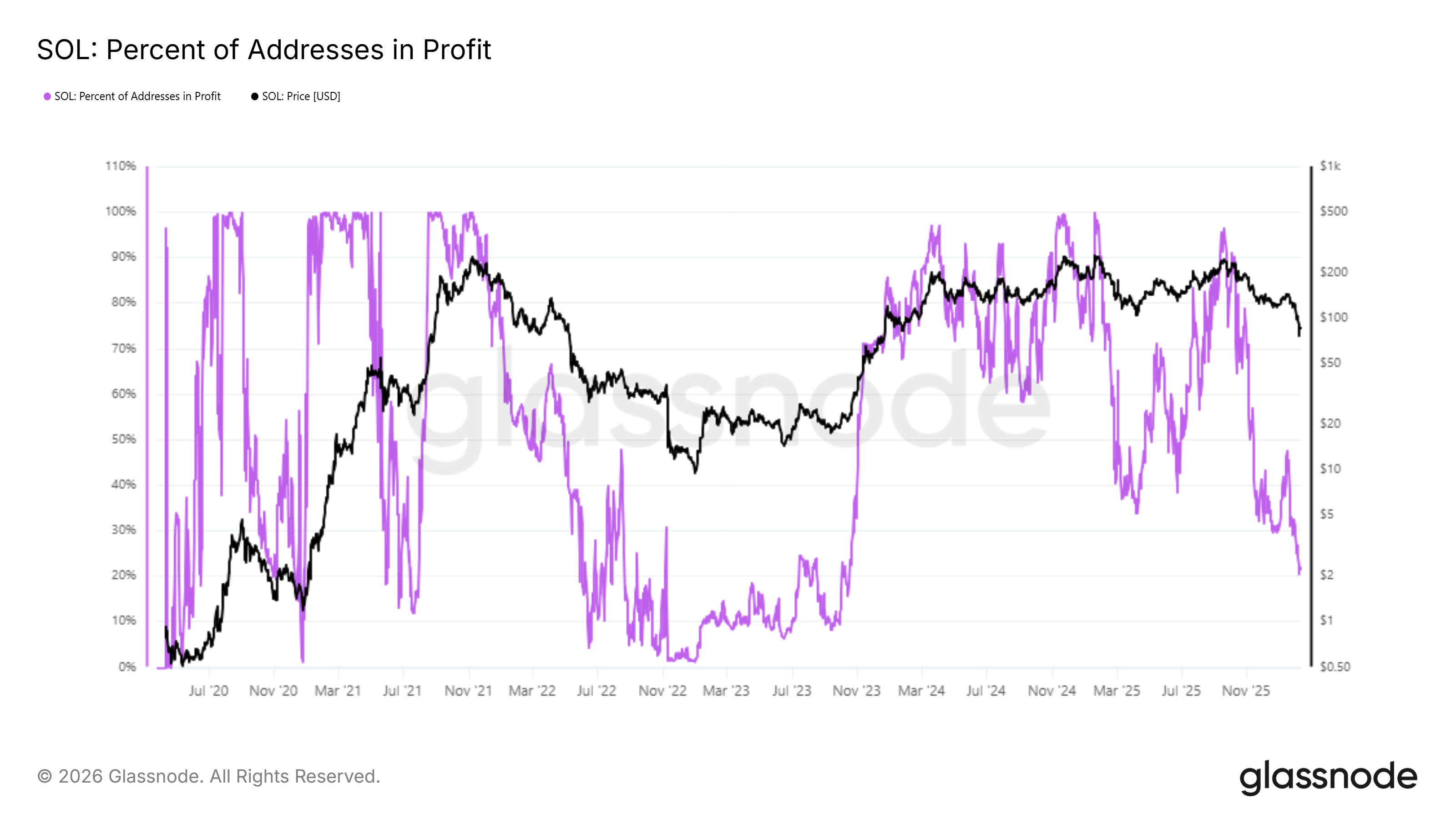 Profitability data reinforces this outlook. Only 21.9% of Solana addresses are currently in profit, meaning roughly 78.1% of holders are underwater. This level of distress has historically aligned with market bottoms, as lower prices tend to attract demand from value-oriented participants.