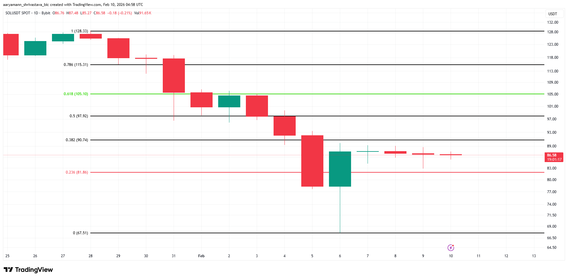 Solana is trading near $86 at the time of writing, holding above the 23.6% Fibonacci retracement. This level is often described as bear market support. As long as $SOL remains above it, downside risk appears contained, increasing the probability of a technical bounce.