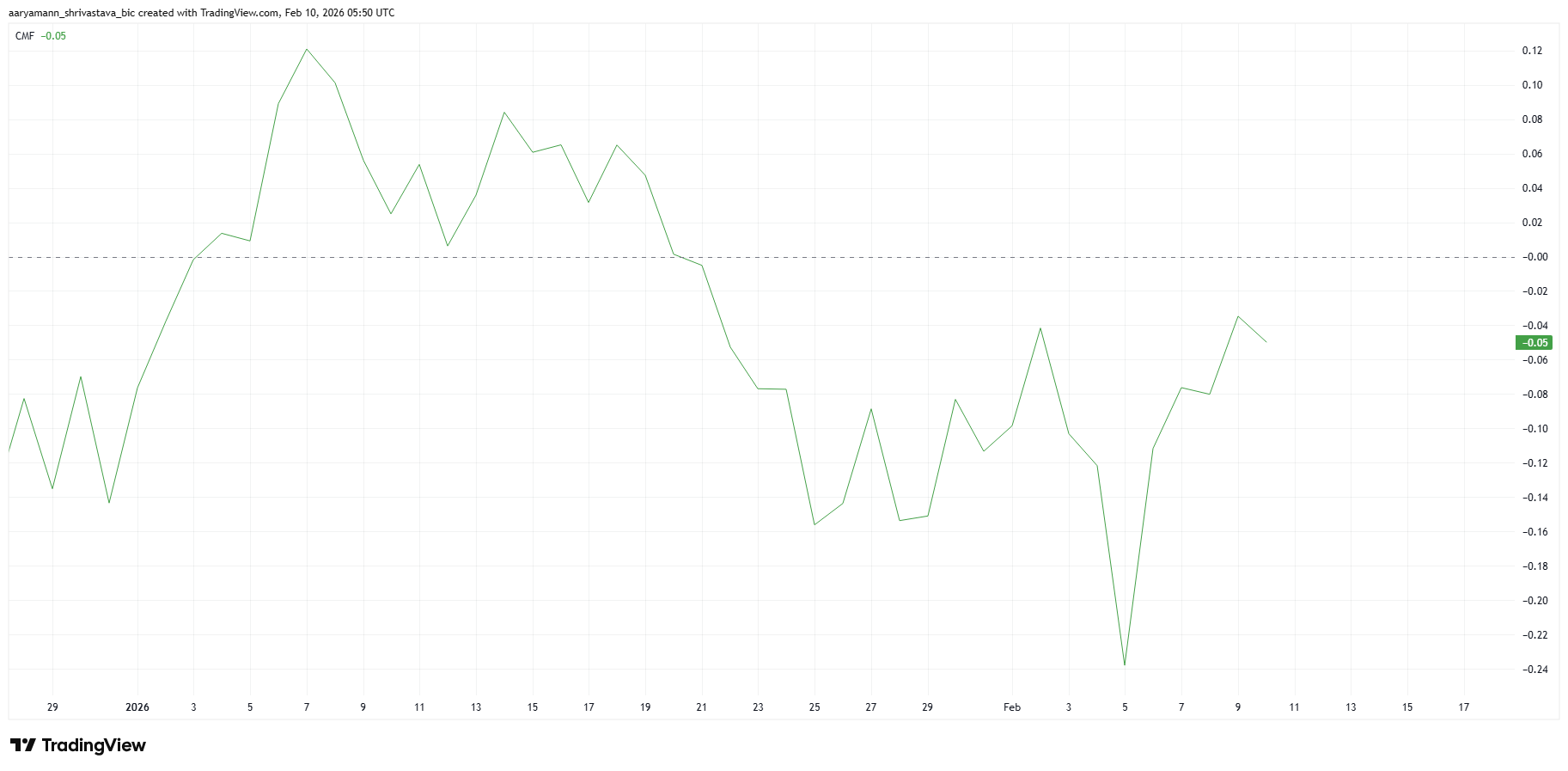Current stabilization suggests $SOL may be forming a bottom. Any recovery will likely depend on improving capital flows. The Chaikin Money Flow indicator shows an uptick while still in negative territory. This shift suggests outflows are slowing, an early signal that selling pressure is easing.