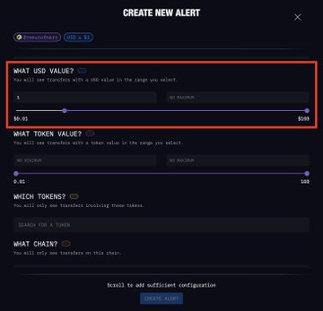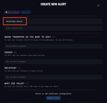 2) Rename your alert to something memorable, then scroll down and change the USD filter to the minimum transaction size you’d want to receive alerts for. Leave it at $1 to see all non-spam transactions.
