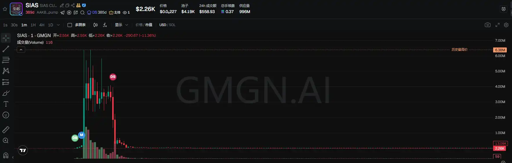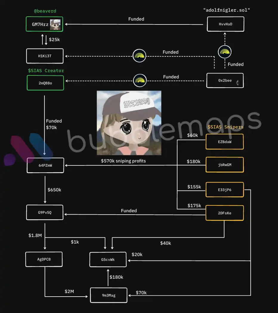 Bubblemaps reported finding a linked address, "2mQB8o," based on Beaver's public Solana address. This linked address issued the token $SIAS on pump.fun . $SIAS quickly reached a market capitalization of $6 million within 7 minutes of deployment, then rapidly dropped to zero within the next 10 minutes due to large-scale selling by devs.