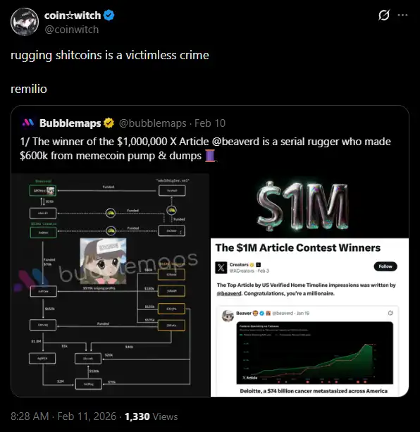 Beaver is a relatively well-known meme coin player in the English-speaking world, so his award was a source of excitement for the crypto. However, two days ago, Bubblemaps tweeted accusations against him, calling him a "serial rugger" who profited $600,000 by manipulating the coin's price.