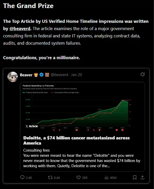 On February 4th, X announced the winner of its million-dollar article contest. @beaverd won the $1 million prize with his article "Deloitte, a $74 billion cancer metastasized across America".