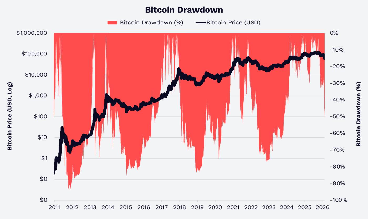 Bitcoin is highly volatile, but its pullbacks are gradually narrowing. In previous cycles, the drop from peak to trough typically exceeded 70% to 80%. However, in the current cycle since 2022, as of February 8, 2026, the price of Bitcoin has never fallen more than 50% from its all-time high (as shown in the chart below), indicating increasing market participation and more abundant liquidity.