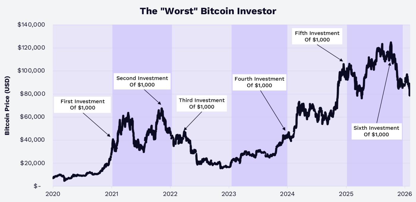 According to Glassnode data, from 2020 to 2025, even the "worst investor" who bought $1,000 at the peak each year would have seen their initial $6,000 grow to approximately $9,660 by the end of 2025, a return of about 61%; by the end of January 2026, they would still have a return of about 45%; and even after the adjustment in early February, they would still have a return of about 29% by February 8.