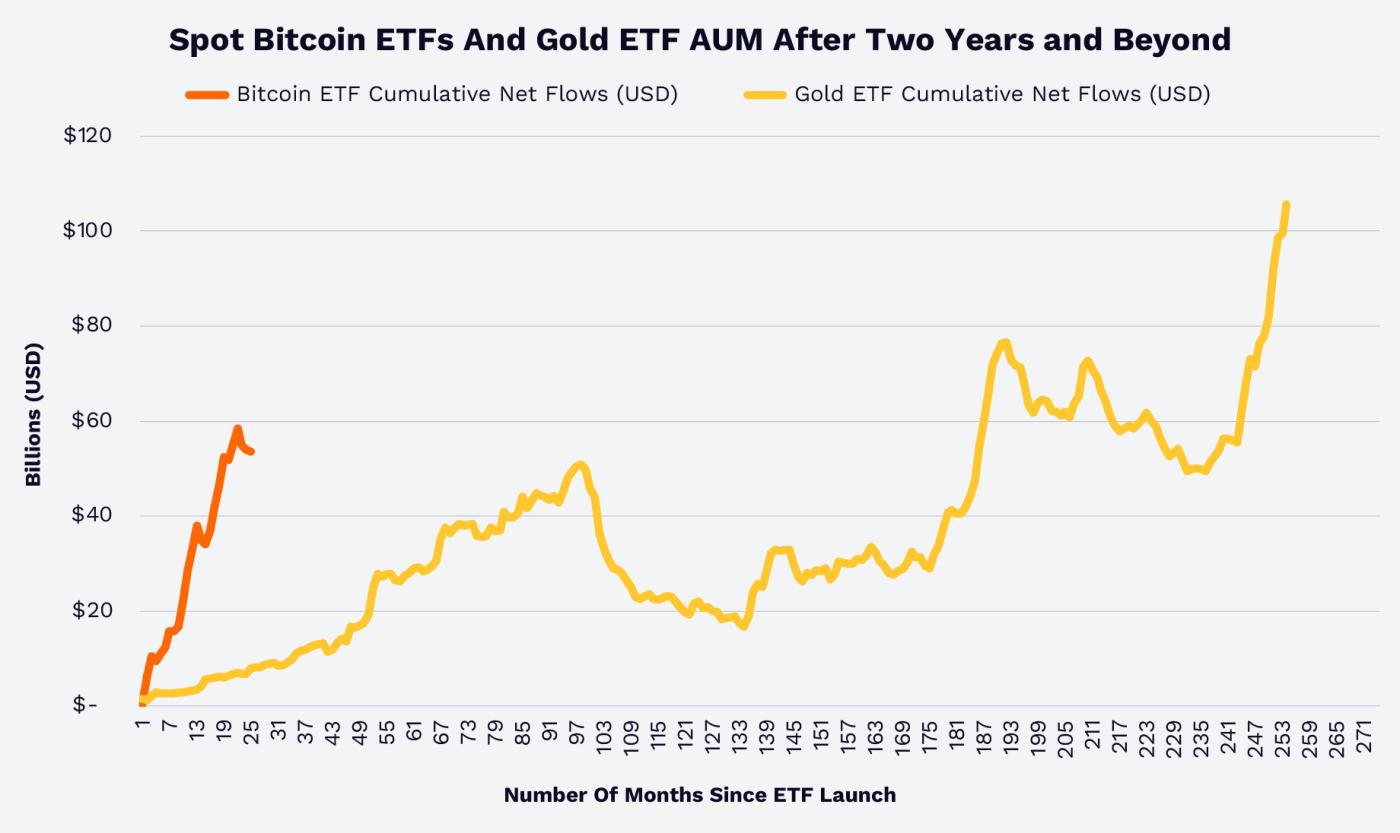Looking at cumulative ETF fund flows, Bitcoin spot ETFs have accomplished in less than two years what gold ETFs took over 15 years to achieve. This suggests that financial advisors, institutional investors, and retail investors seem to place greater emphasis on Bitcoin as a store of value, a diversification tool, and a new asset class.