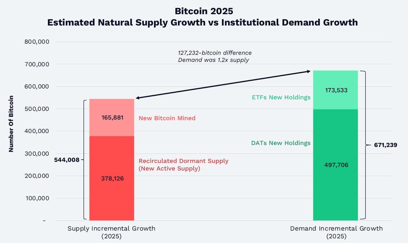 Comparison of new circulating supply of Bitcoin to institutional demand in 2025. Source: ARK Investment Management LLC and 21Shares