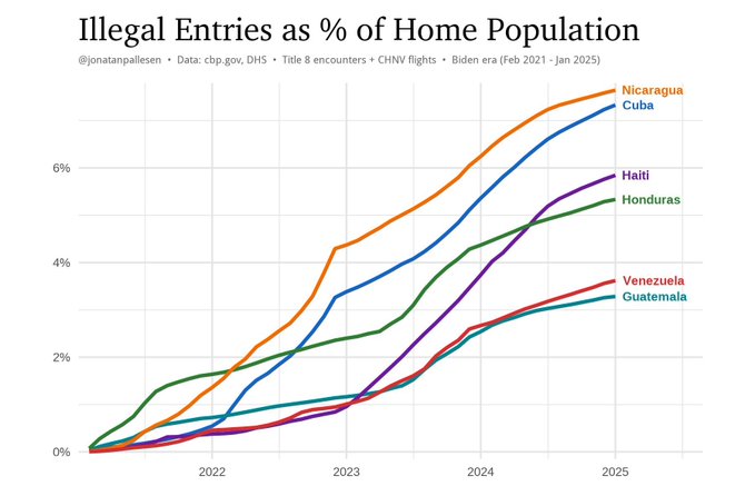 Most Americans still don’t fully understand what happened under Biden… 8% of Nicaragua entered the US in 4 years. 8% of the entire country. 7% of Cuba. 6% of Haiti. 5% of Honduras.
