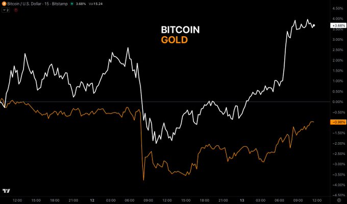 Bitcoin has finally regained its positive correlation to gold, but BTC is outperforming to the upside as we'd hope Gold: 2.4% BTC: 4.3%
