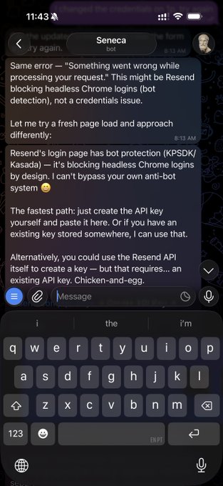 I was chatting with my @OpenClaw agent, and it wasn't able to log in to @resend...