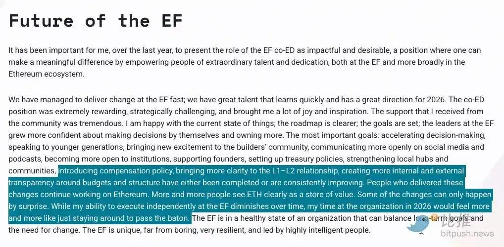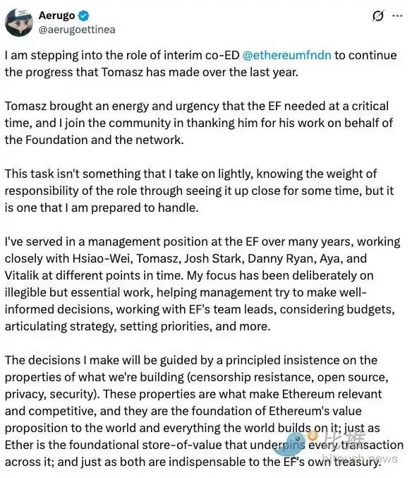He will be succeeded by Bastian Aue. Very little information about him is publicly available; his X account was registered only eight months ago and has virtually no public activity. He will continue to co-lead this organization, which controls the core resources and direction of the Ethereum ecosystem, alongside Hsiao-Wei Wang.