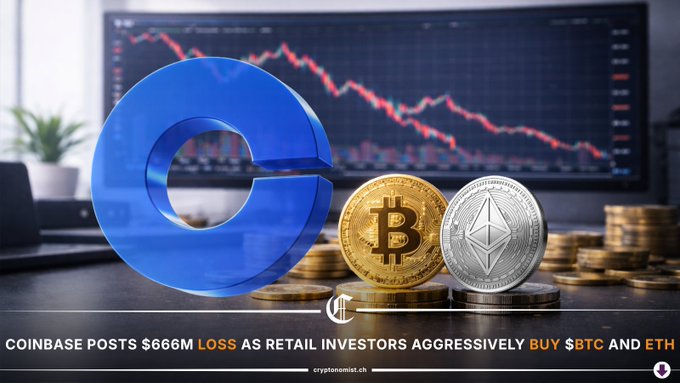 COINBASE POSTS $666M LOSS, RETAIL BUYS Coinbase reports a $666M loss, yet retail users increased $BTC and ETH balances during the correction. Stock hits multi-year lows while platform accumulation rises. It matters because confidence is shifting from institutions to individuals. Is retail becoming crypto’s structural backbone? Full analysis 👇 en.cryptonomist.ch/2026/02/16/...… #CryptoNews #Bitcoin #Coinbase #DigitalAssets #CryptoConversations
