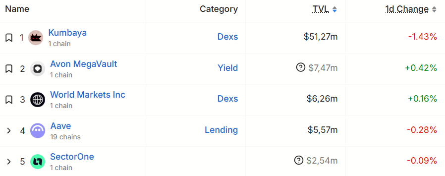 Behind Kumbaya, yield‑oriented vault Avon MegaVault, unified DEX World Markets and multi-chain lending protocol Aave collectively hold about $19 million in TVL as of press time.