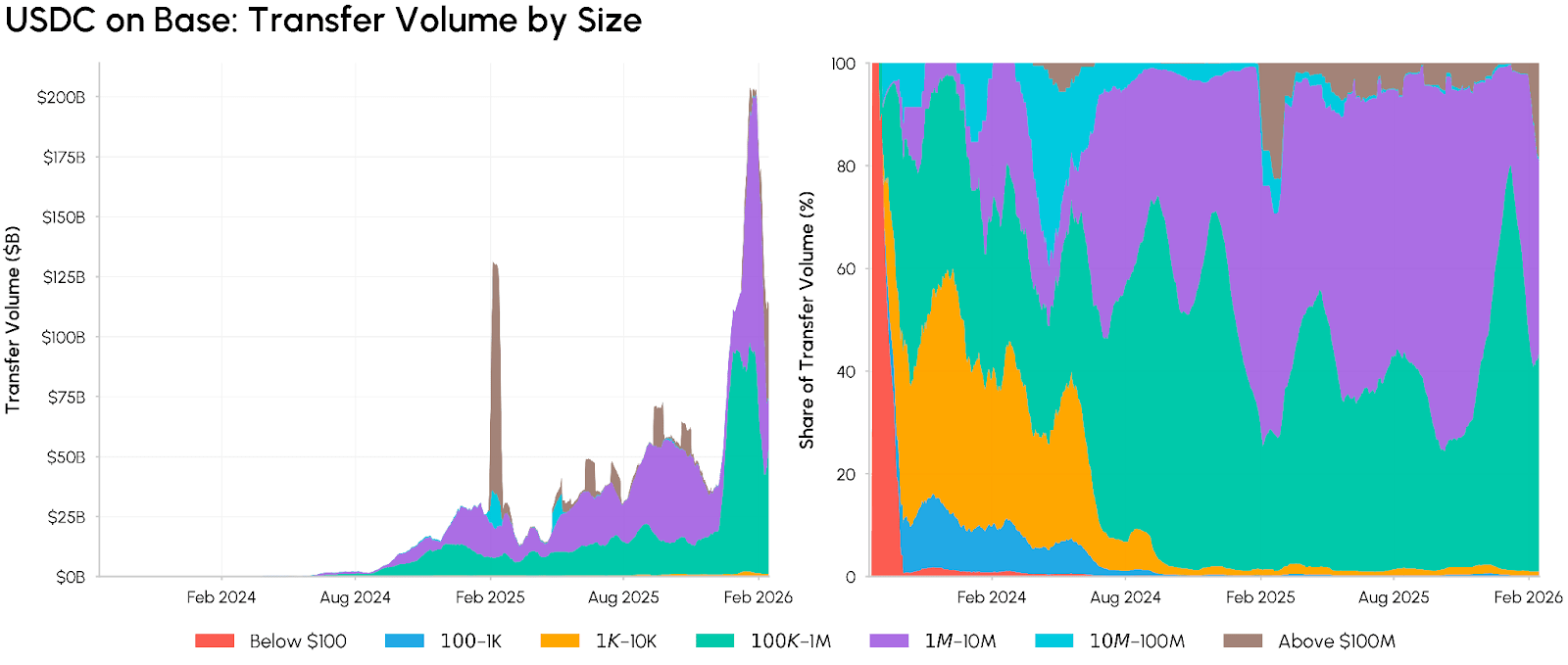 Large transfers between $100K–$1M and $1M–$10M now dominate, together accounting for roughly 90% of all transfer value. Smaller transaction bands have compressed, despite an uptick in low-value USDC transfers, partly driven by emerging use cases like AI-agent micropayments through x402 payments protocol. The $10M–$100M and above $100M bands also spike intermittently, pointing to periodic whale sized flows.