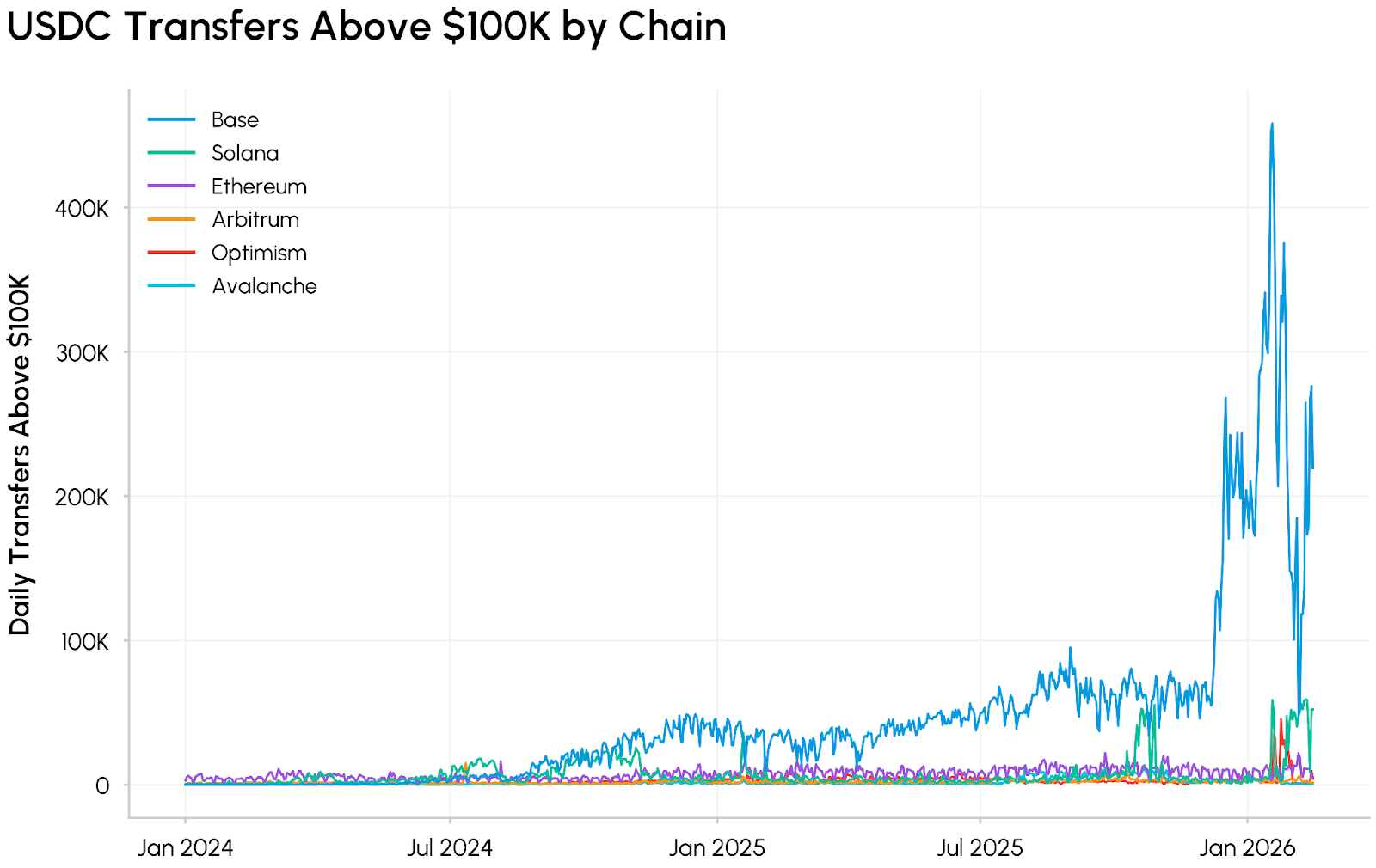 The surge is driven by large transfers: daily USDC transfers above $100K on Base grew from under 50,000 to over 450,000 in January 2026, dwarfing all other chains.