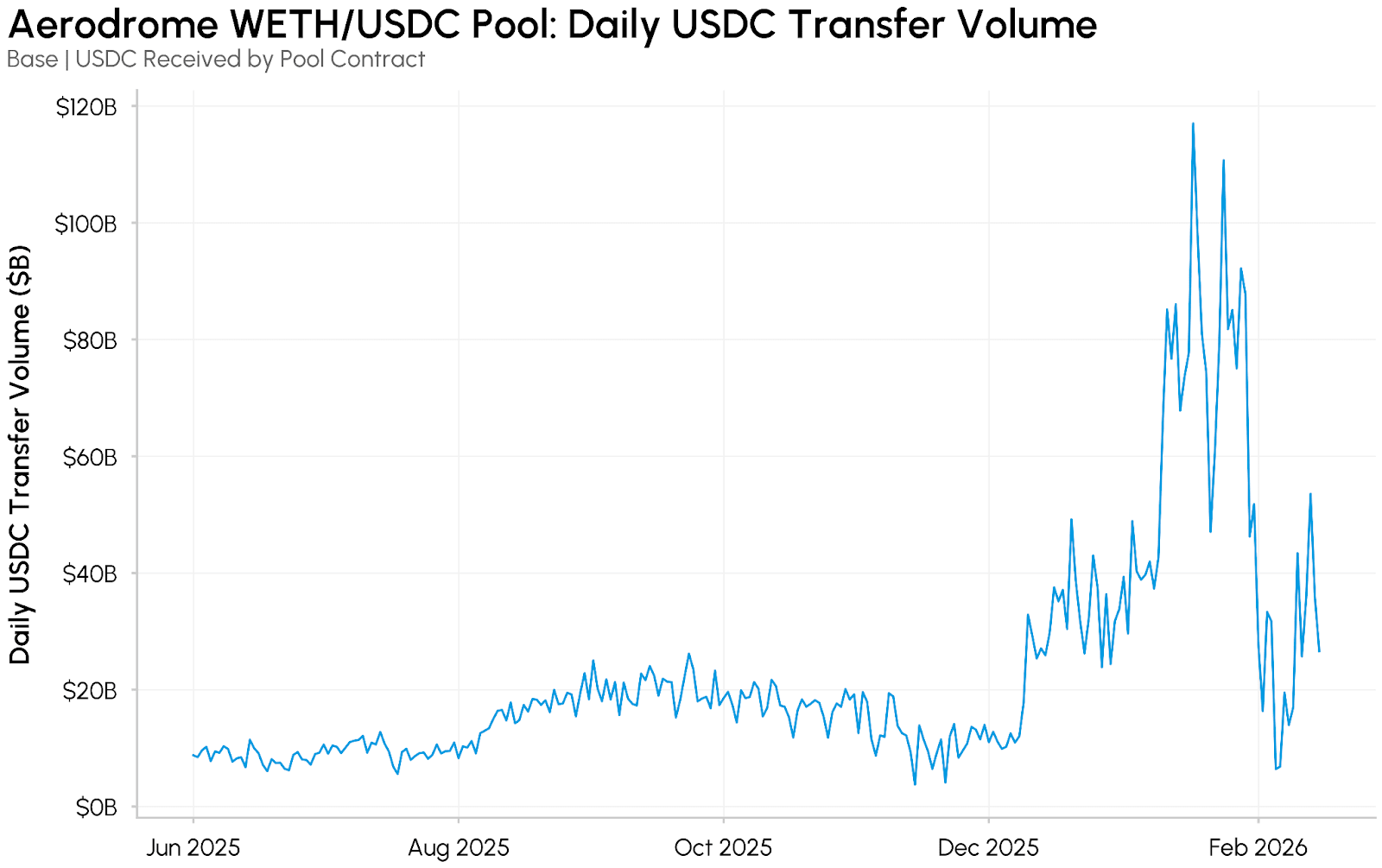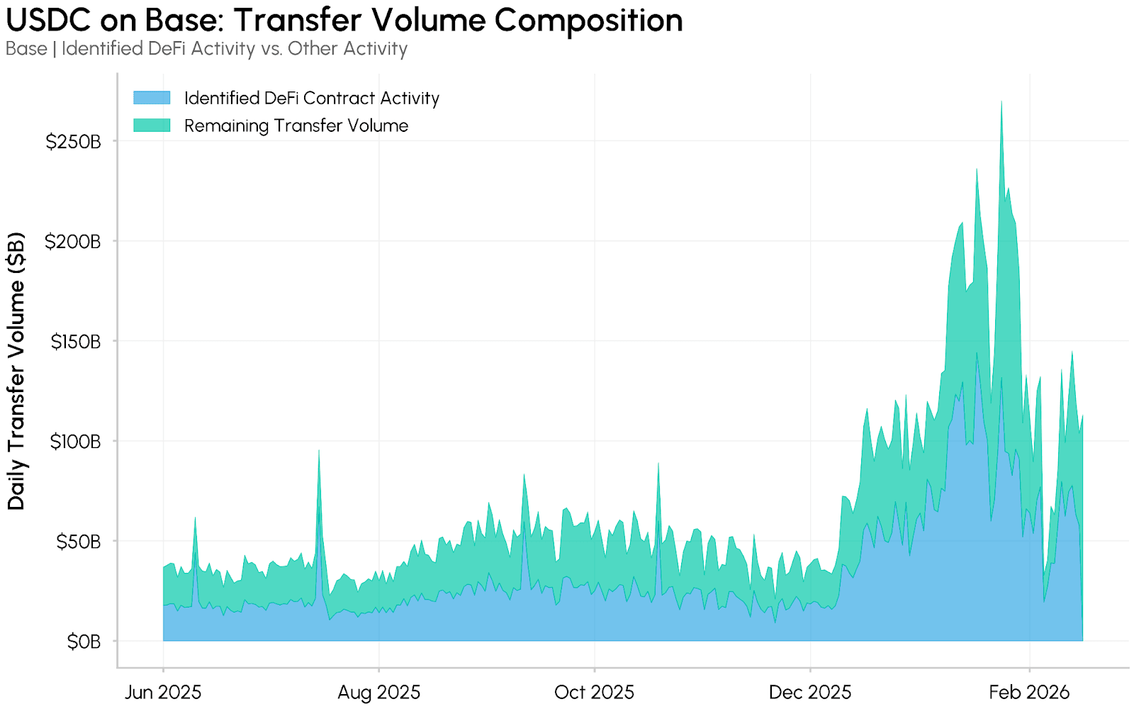 In January 2026, these identified DeFi contracts accounted for an estimated ~50% of the $5.3T in USDC adjusted transfer volume on Base, linking directly to LP rebalancing on DEXs, flash loan arbitrage, and related DeFi mechanical activity. The remaining activity still shows healthy growth, but nowhere near the $200B+ daily peaks that drove the headline figure.
