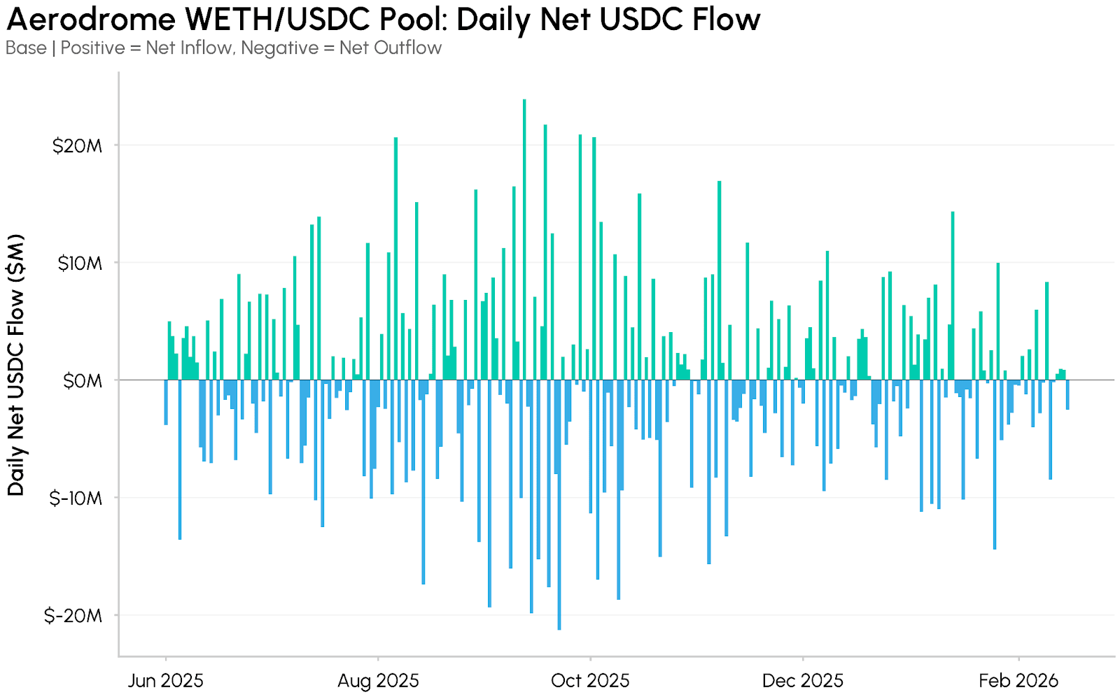 Concentrated liquidity rebalancing: As ETH price moves, LPs and automated vault strategies withdraw USDC and re-deposit at updated tick ranges. Each rebalance generates large inflows and outflows with little net effect on the pool’s balance.