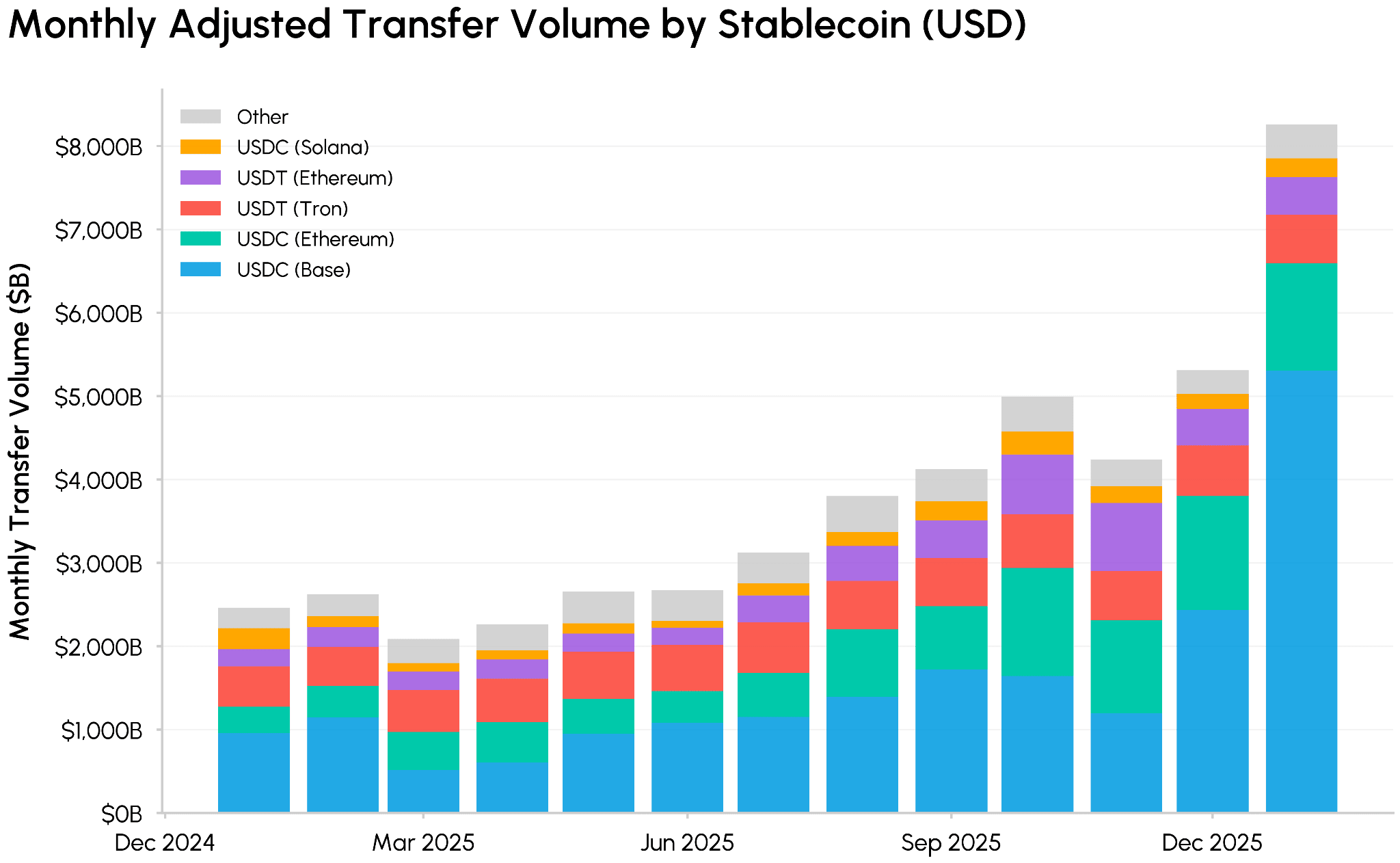 In January 2026, adjusted stablecoin transfer volume hit a record $8T, with the majority of growth driven by USDC on Base.