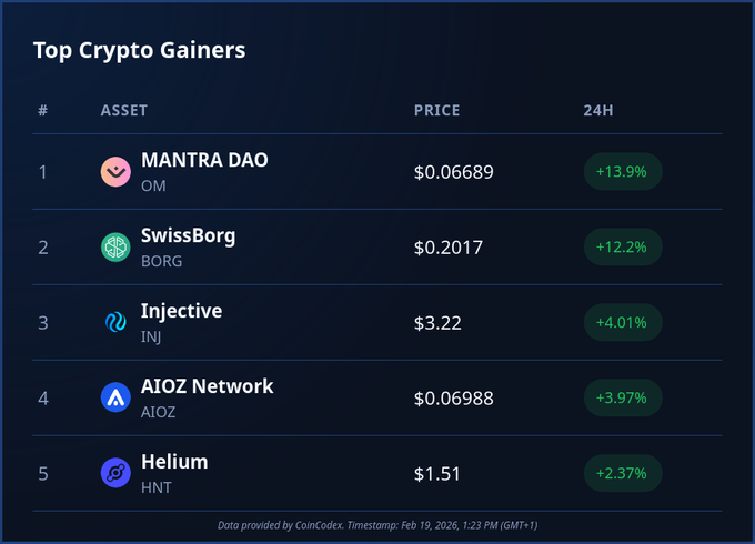Today's top #crypto performers: 💠 $OM (+13.9%) 💠 $BORG (+12.2%) 💠 $INJ (+4%) 💠 $AIOZ (+3.9%) 💠 $HNT (+2.3%) The #altcoin markets are subdued as #Bitcoin continues to display weakness.