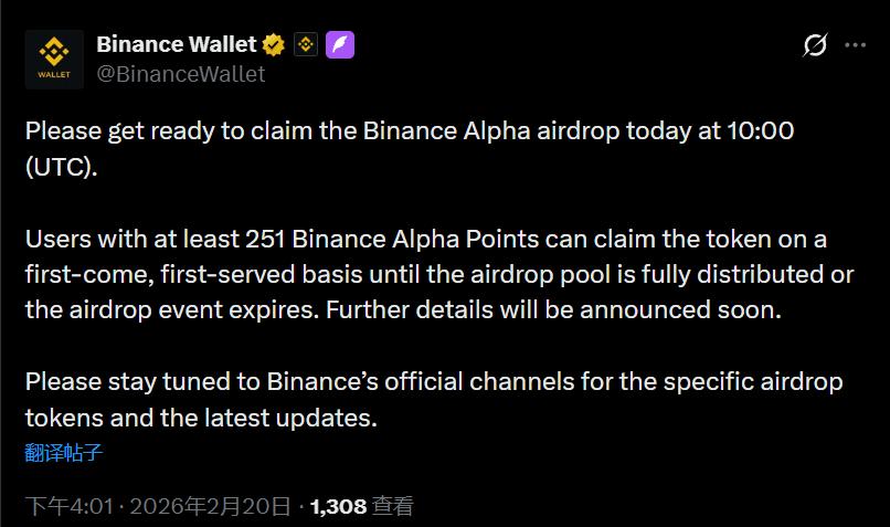 According to a report by TechFlow TechFlow on February 20th, Binance Wallet officially announced that users with at least 251 Binance Alpha Points can claim tokens on a first-come, first-served basis starting at 18:00 today, until the airdrop pool is fully distributed or the airdrop event ends.