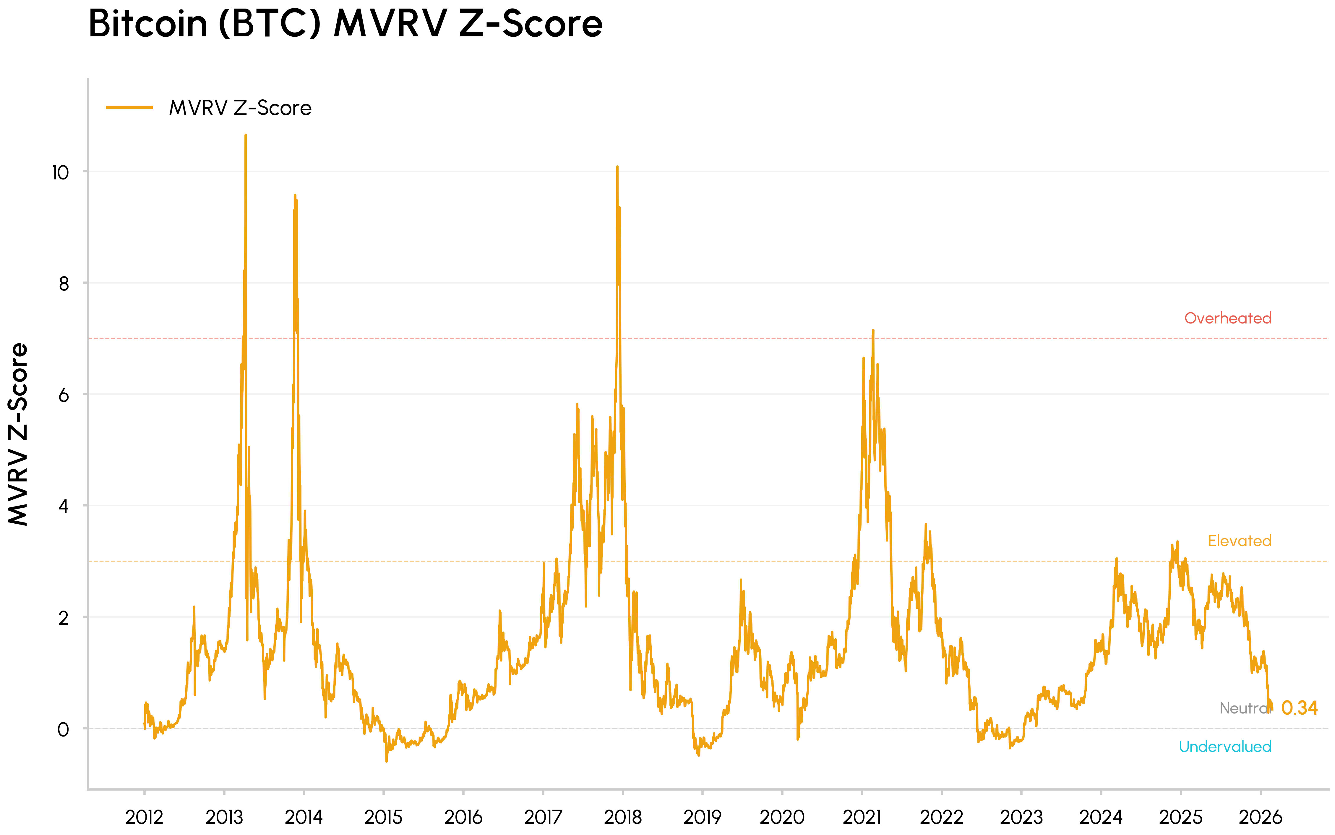 At the same time, valuation metrics such as MVRV (which compares Bitcoin’s market value to the aggregate onchain cost basis of holders), has compressed toward its historical undervaluation bands but have not yet reached the extreme levels associated with prior bear market bottoms. These indicators point to a market that has shed much of its earlier excess and is drifting toward a value zone.