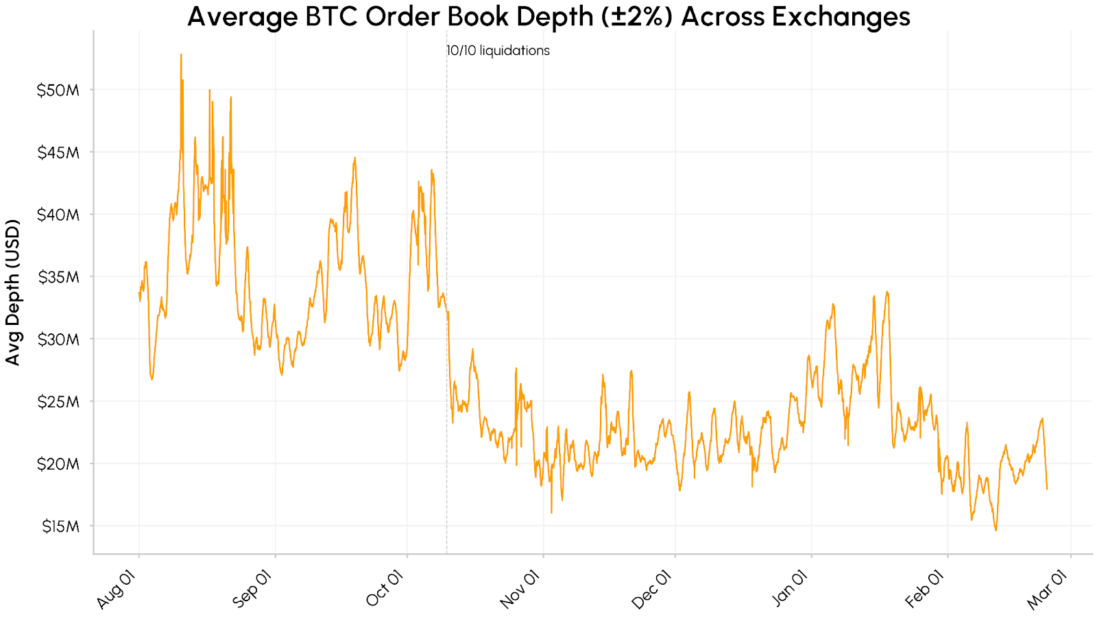 Compounding this, market liquidity also remains fragile. Average spot BTC order book depth across major exchanges, measured as liquidity within ±2% of mid-price, collapsed from roughly $40–50M in August through October 2025 to a sustained $15–25M range. Liquidity has thinned further in February, directly amplifying the severity of price dislocations.