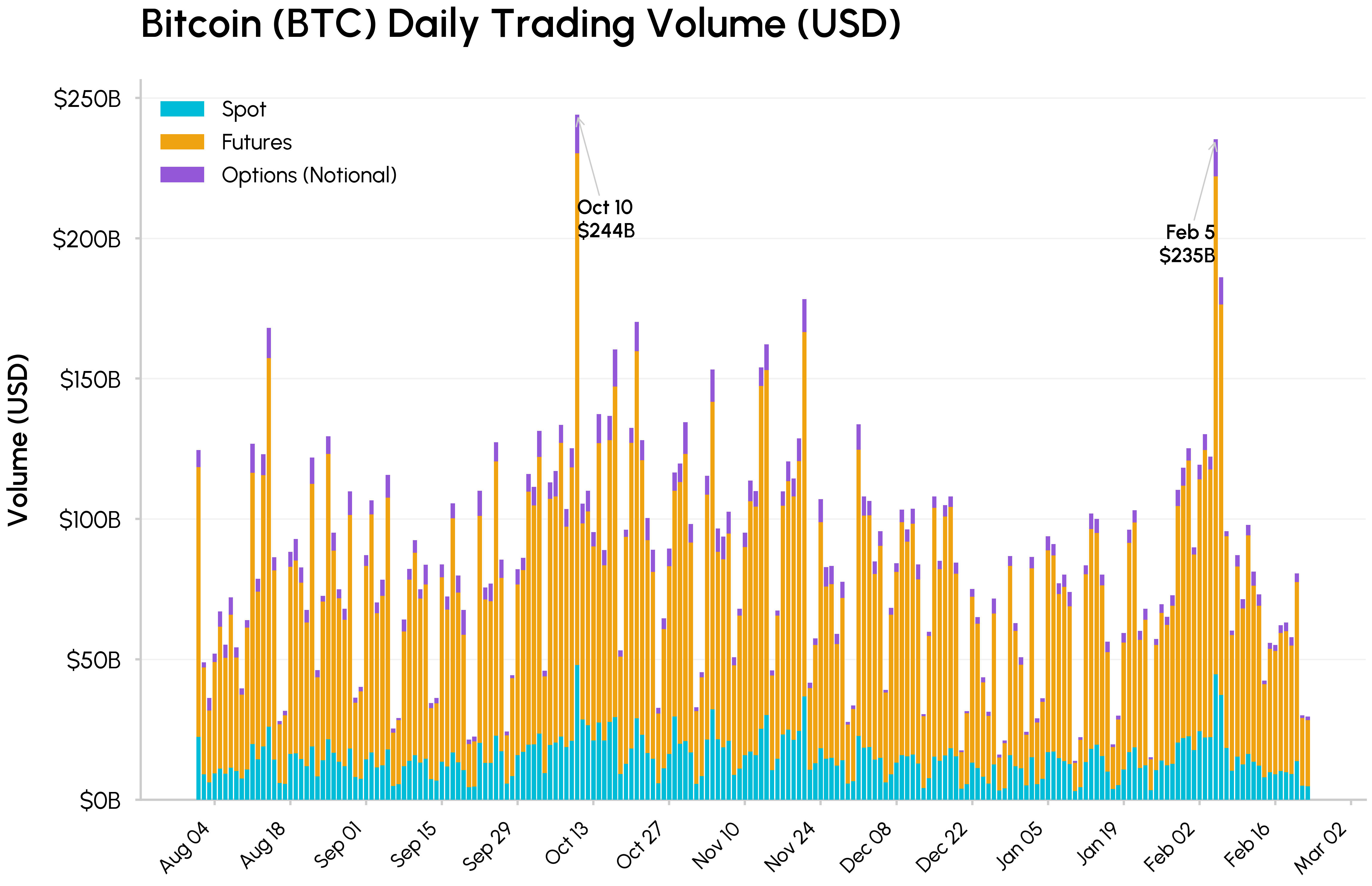 Trading volume across spot, futures and options spiked sharply on both October 10th and February 5th. Total BTC volume reached $244B and $235B respectively, with futures dominating at $177B on February 5th. Spot volume was marginally lower than in October despite a comparably severe dislocation, consistent with thinner order books amplifying the move. Historically, high‑volume selloffs of this kind often coincide with the exhaustion of forced selling, suggesting the most aggressive phase of the drawdown may be nearing its end.
